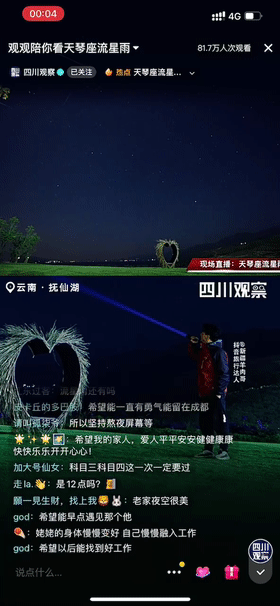 抚仙湖南岸纯净且极低光污染的夜空成为了这次流星雨的较佳观测地这个消息被抖音网友“新疆羊肉哥”捕捉来到抚仙湖星空小镇崖顶公园对本次天琴座流星雨进行现场直播