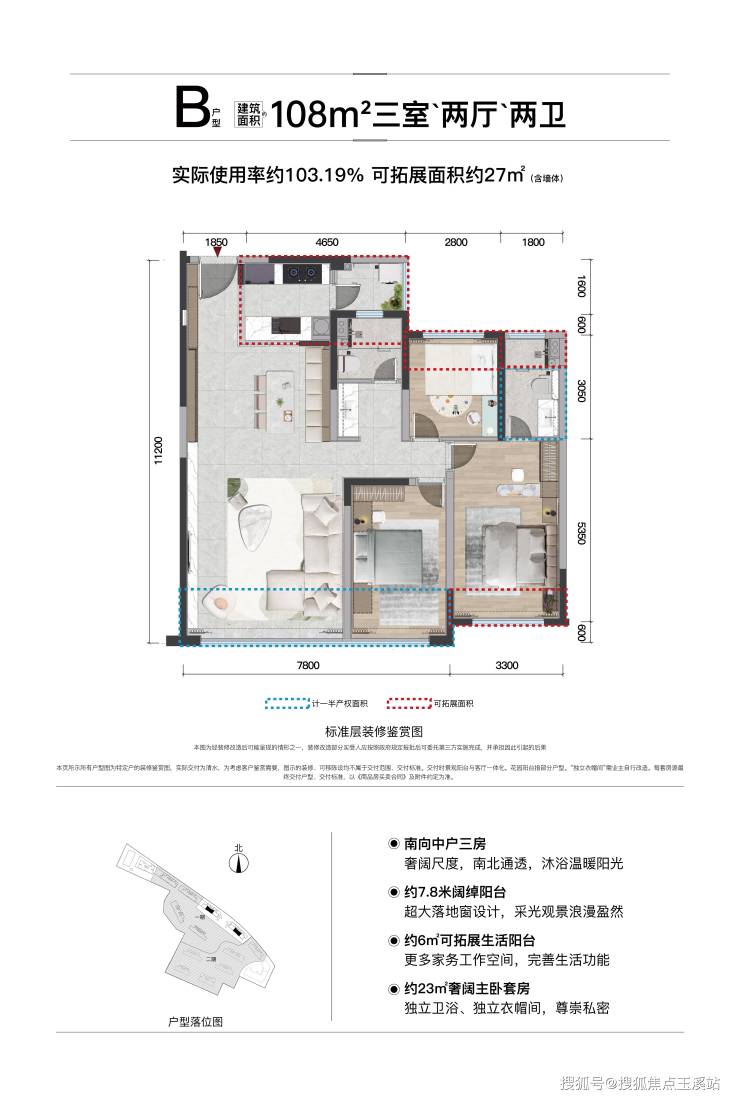 T4——108㎡ 南北向舒适型三房,使用率约103.19%