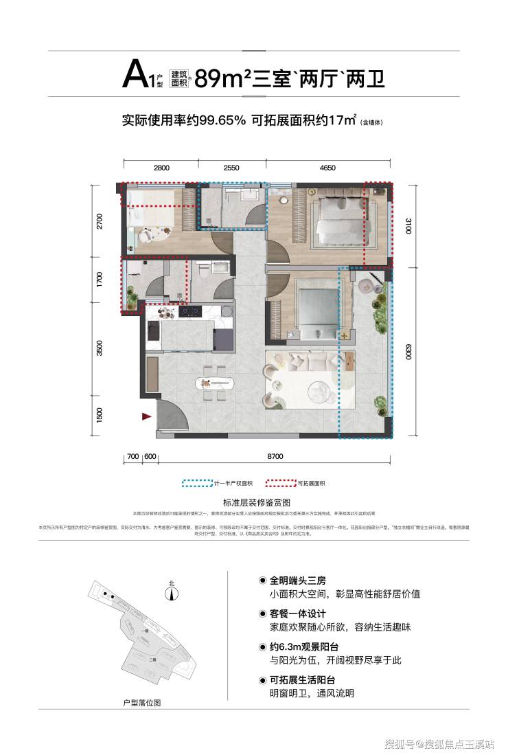 T6——89㎡ 全明端头三房,使用率约99.65%