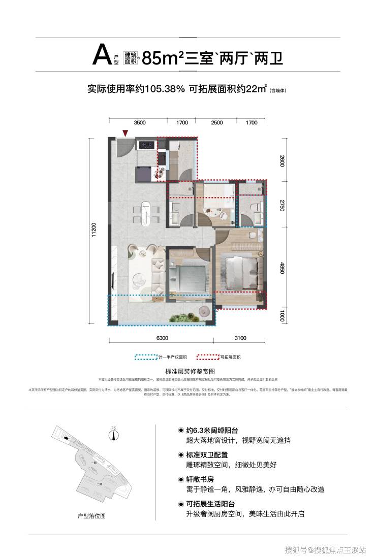 T6——85㎡ 全功能三房,使用率约105.38%