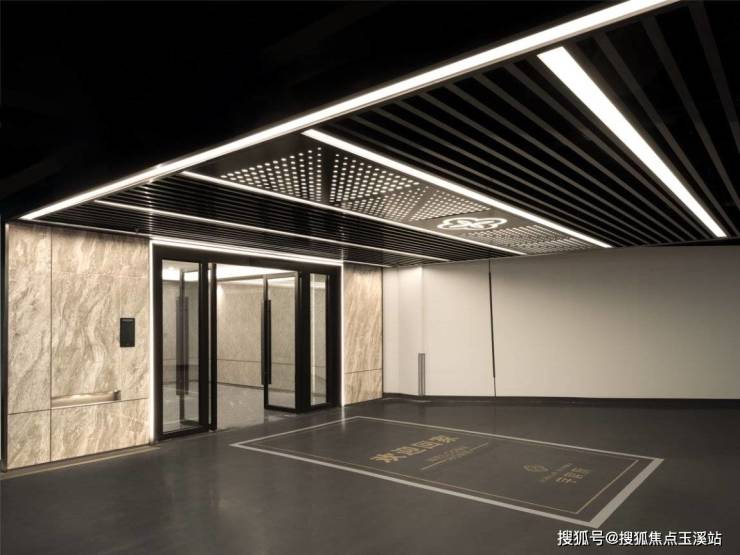 天花金属(格栅+局部镂空铝板)+专属项目 LOGO,地面划线,天地呼应,归家极致昭示性与仪式感,大面宽玻璃门,增强归家空间通透性