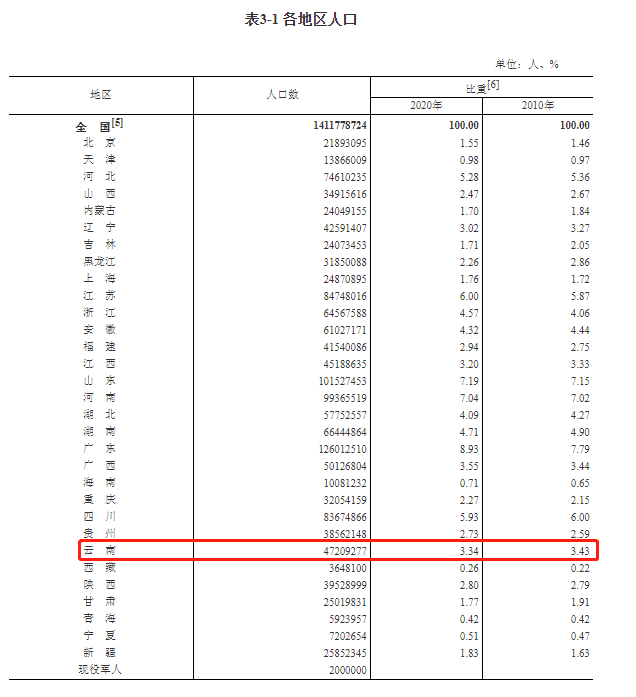 其中,云南省总人口为47209277人,人口性别比(以女性为100,男性对女性的比例)为107.16;0—14岁人口占比19.57%,15—59岁人口占比为65.52%,60岁及以上人口占比14.91%(其中:65岁及以上人口占比10.75%)。