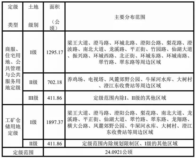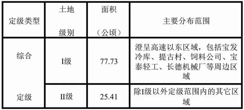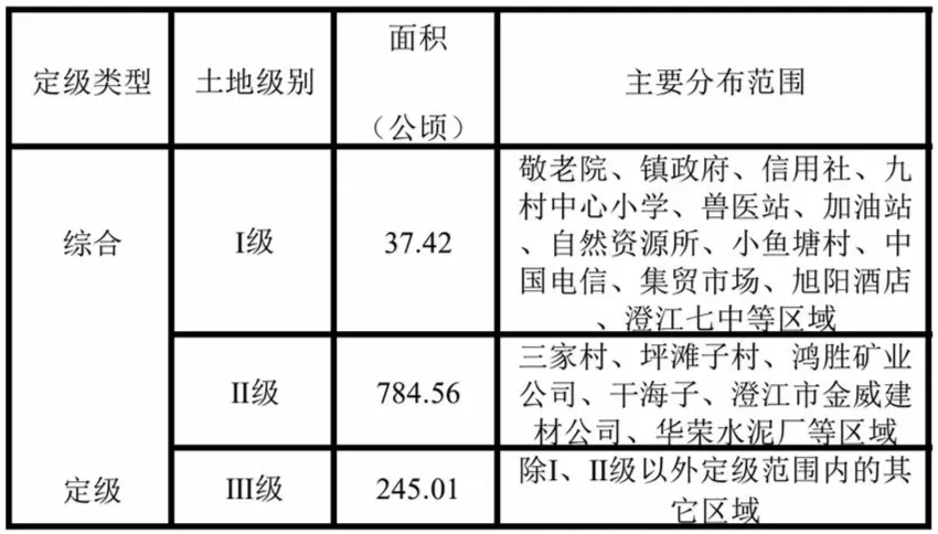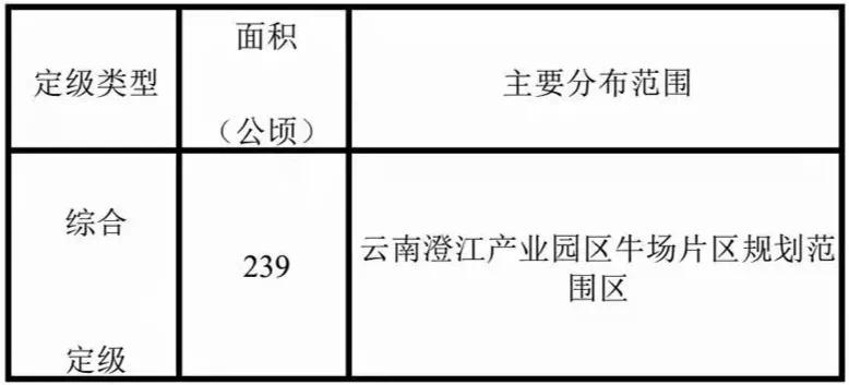 表1 澄江市城市规划区各定级类型土地级别分布范围及面积表
