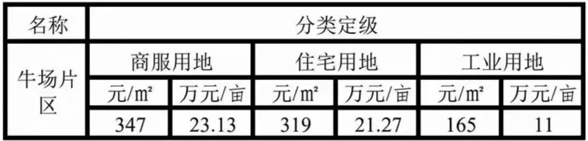 表8 云南澄江产业园区牛场片区土地级别分布范围及面积表