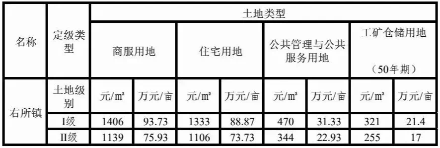 表12 右所镇集镇规划区基准地价测算结果汇总表