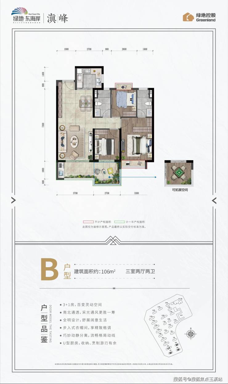 在户型创新上,“桃李赋”组团展现了绿地产品系的迭代功力。79-143㎡的纯板式设计中,全南向采光与L型可拓展阳台成为标配。以建面约110㎡的三房为例,约6.8米的双厅阳台实现270°观景视野,厨房U型布局优化操作动线,主卧套房设计兼顾私密性与舒适度。围合式布局形成的中央景观轴,与临路带状公园构成“双公园”体系,实现了“推窗见绿,移步即景”的居住意境。