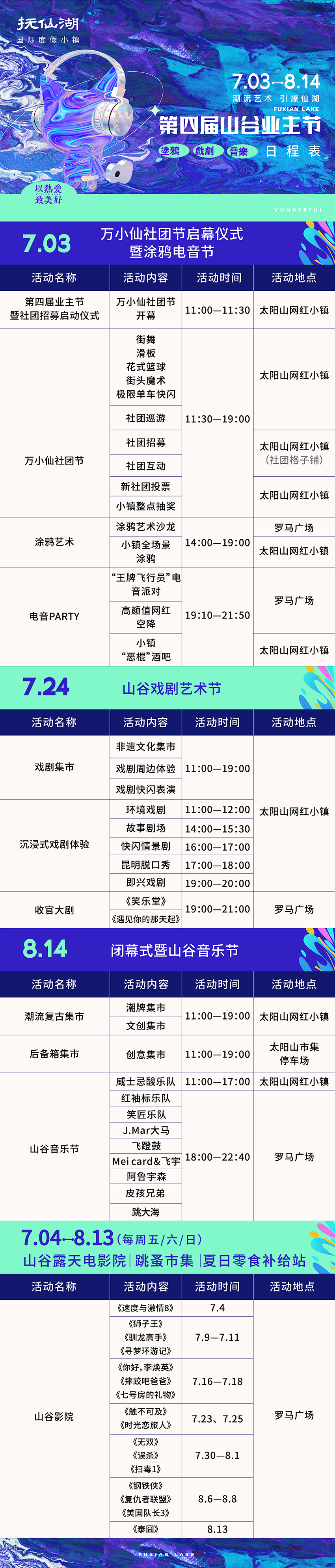 欢乐 将是第四届山谷业主节不变的伴奏 7月3日起 旧友新朋亲密相聚 艺术之美尽情释放 美好枝芽自由生长 一年一度的欢乐启程 酝酿出长长的影子 在热烈之夏 邀您一起 以仪式,照亮所有关于热爱的梦 特邀嘉宾: 10位行业KOL意见领袖 10位昆明流量网红深度参与 特邀品牌 即将揭晓: 敬请关注抚仙湖国际