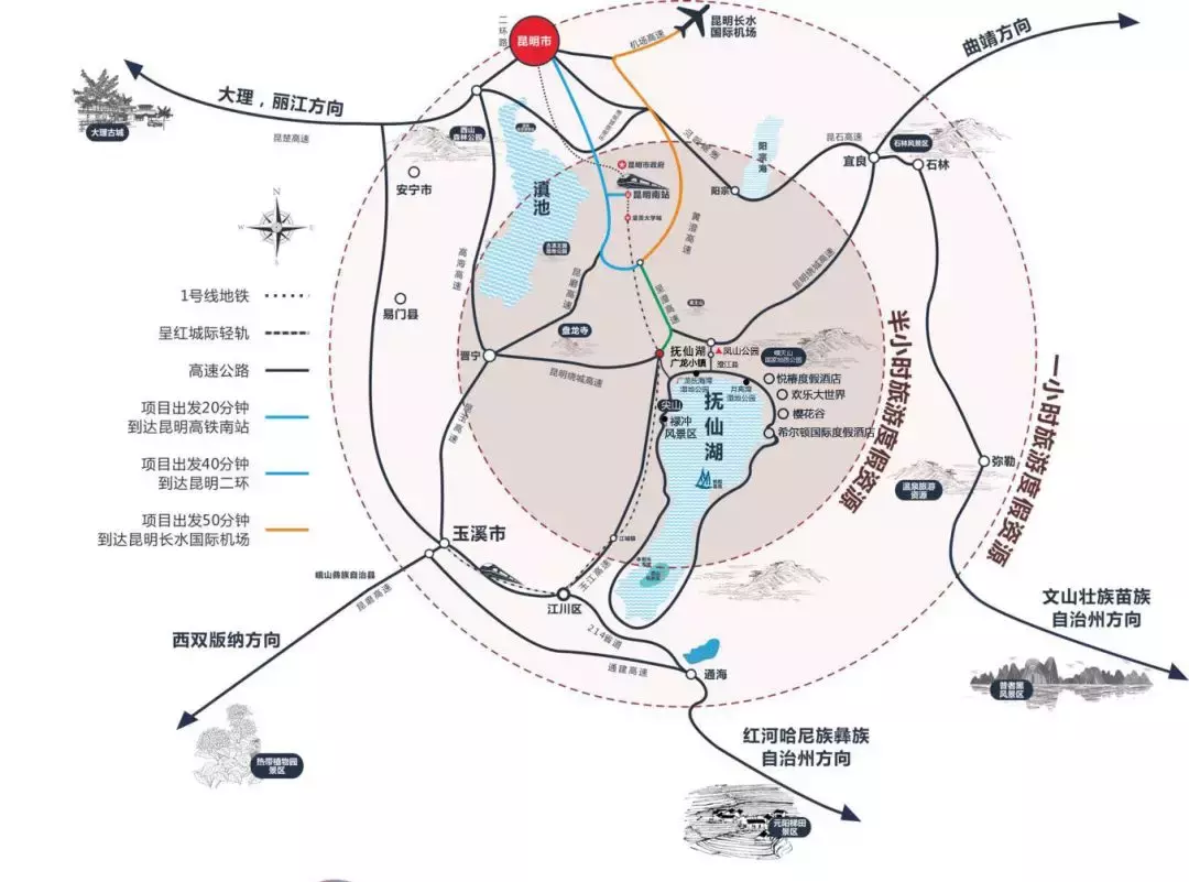 在整个抚仙湖北湾区,通过呈澄高速出入口连接到高铁站、机场、昆明市区,目前已聚集了抚仙湖广龙小镇、云南寒武纪小镇欢乐大世界、中国抚仙湖国际度假区以及樱花谷等多个高端项目,沿抚仙湖的北岸线形成一个围合,一个高级的旅游湾区正在向世人呈现,湾区财富效应也随之释放。