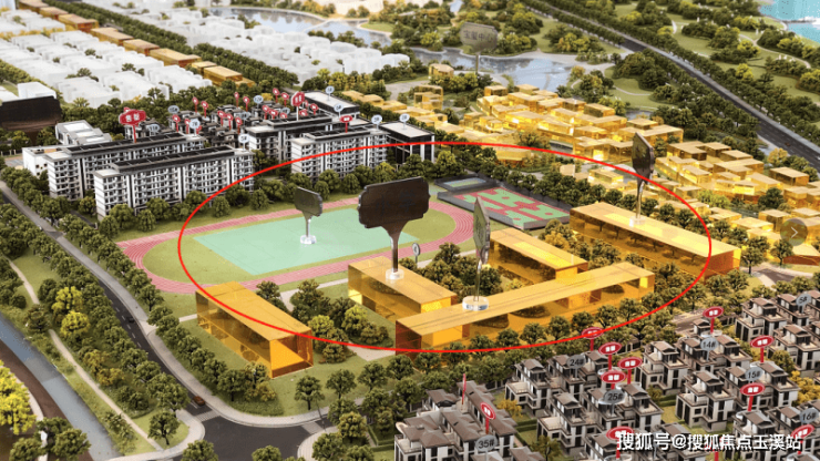 1期第二地块,中间地块为学校用地,预计引入12班国际双语幼儿园、24班小学、20班中学。