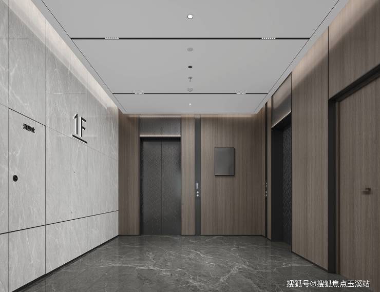 项目围合布局,超大视野大中庭,外立面底座采用海蓝宝石材,搭配深灰色和米白色质感涂料,灰色金属线条,双层中空LOW-E玻璃等,尽显高奢形象