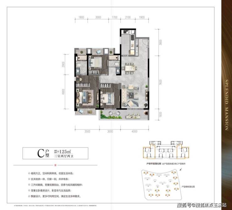 C户型:建筑面积约127㎡,三室两厅两卫