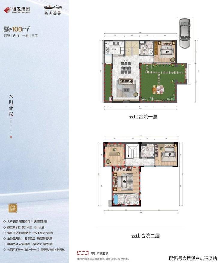 合院101产品:嵩山溪谷101㎡的产品,是四房两厅一厨三卫一花园的设计,还有70㎡的不记产权面积(一楼的入户庭院、二楼的书房、主卧都是赠送的),实得面积约170㎡,还赠送独立的车位。
