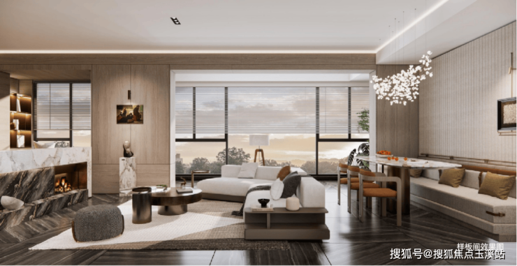以其开阔的布局、灵活的功能,孩子可以在客厅拼积木、玩拼图,大人们在沙发上喝茶聊天,享受欢乐亲子时光;同时宽敞的客厅为宴客提供了便利,彰显着主人的品味与格调。