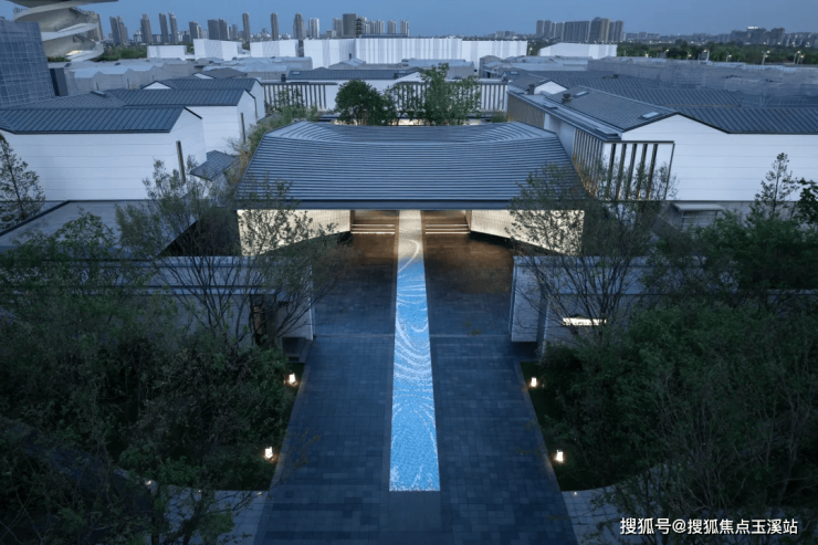 特色铺装折桂路延伸至中式贵气桂华门。金属瓦屋面的坡屋顶,搭配海蓝宝石材装贴,尽显高贵与典雅。