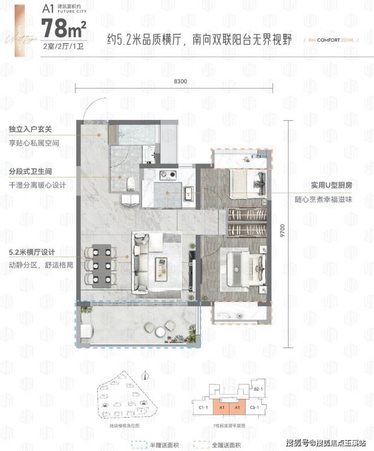 78㎡ 2房2厅1卫 5.2米品质横厅,南向双联阳台,小户型也能有大尺度
