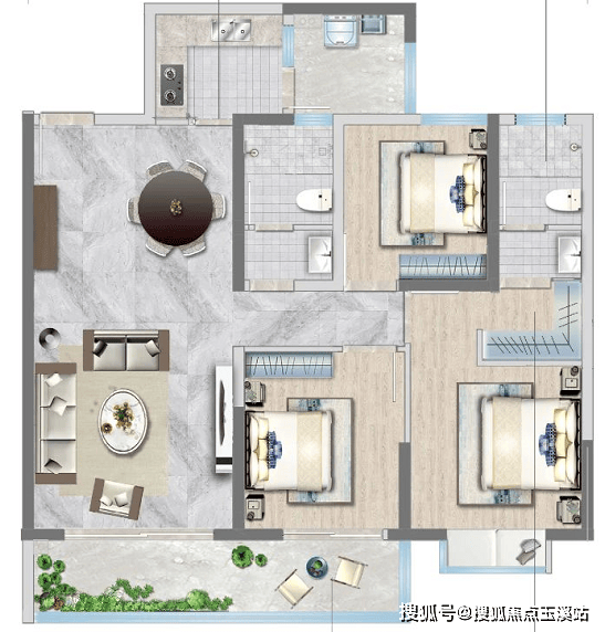 A1户型:建面约106㎡(三室两厅两卫)