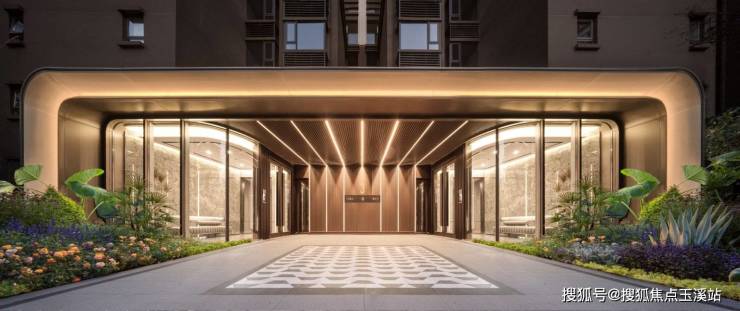 入户门由古铜色铝板搭配银灰色铝板为主框架,弧形铝板搭配曲面玻璃,通过流畅的曲线、轻盈的弧度来营造出优雅、柔和的流体曲线,呈现出学宸府独有的高级美学风格,入户大门设置 16 米长,取“一路顺”之意,入门顺心,出门顺财