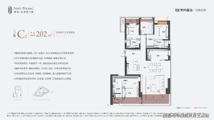 C1观境:建面约198㎡四房两厅三卫双套房北向揽景阳台,阔景视野,尽纳阳光清风南向约11.3m全景采光面,270°环幕视野奢雅主卧,臻配独立衣帽间、卫生间、浴缸次卧配置独立卫浴,衣柜区,尽显尊崇