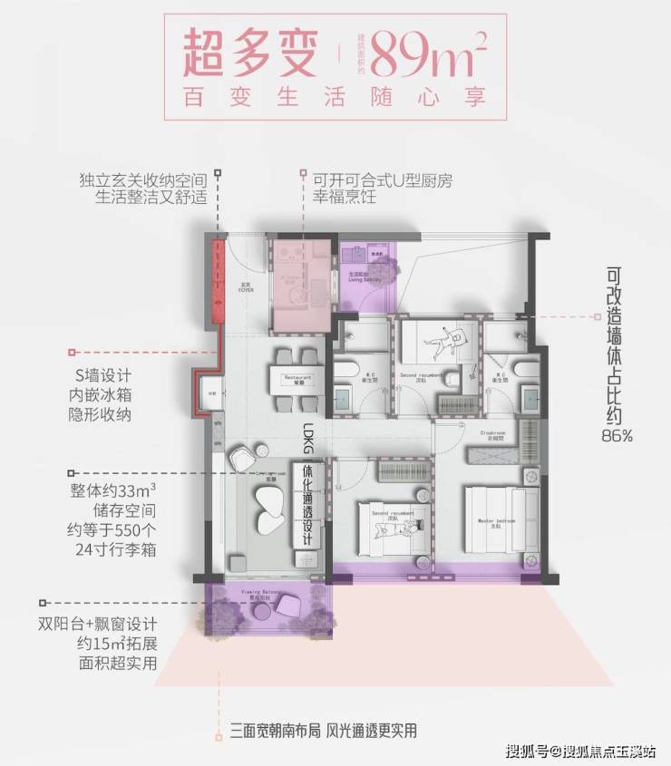 项目在得房率上实现行业突破,82-126㎡户型实得面积达78-127㎡,通过80%非承重墙设计赋予空间极致可变性。以126㎡户型为例,6.6米横厅配合30㎡赠送面积,可改造为4+2房;89㎡户型通过86%的可改造墙体,实现三居双卫的奢适配置;82㎡小户型则创新采用"四分离卫生间"和隐形收纳系统,创造出533个行李箱的储物空间。这种"生长型户型"理念,真正实现了"一套房,N种人生"的居住可能。