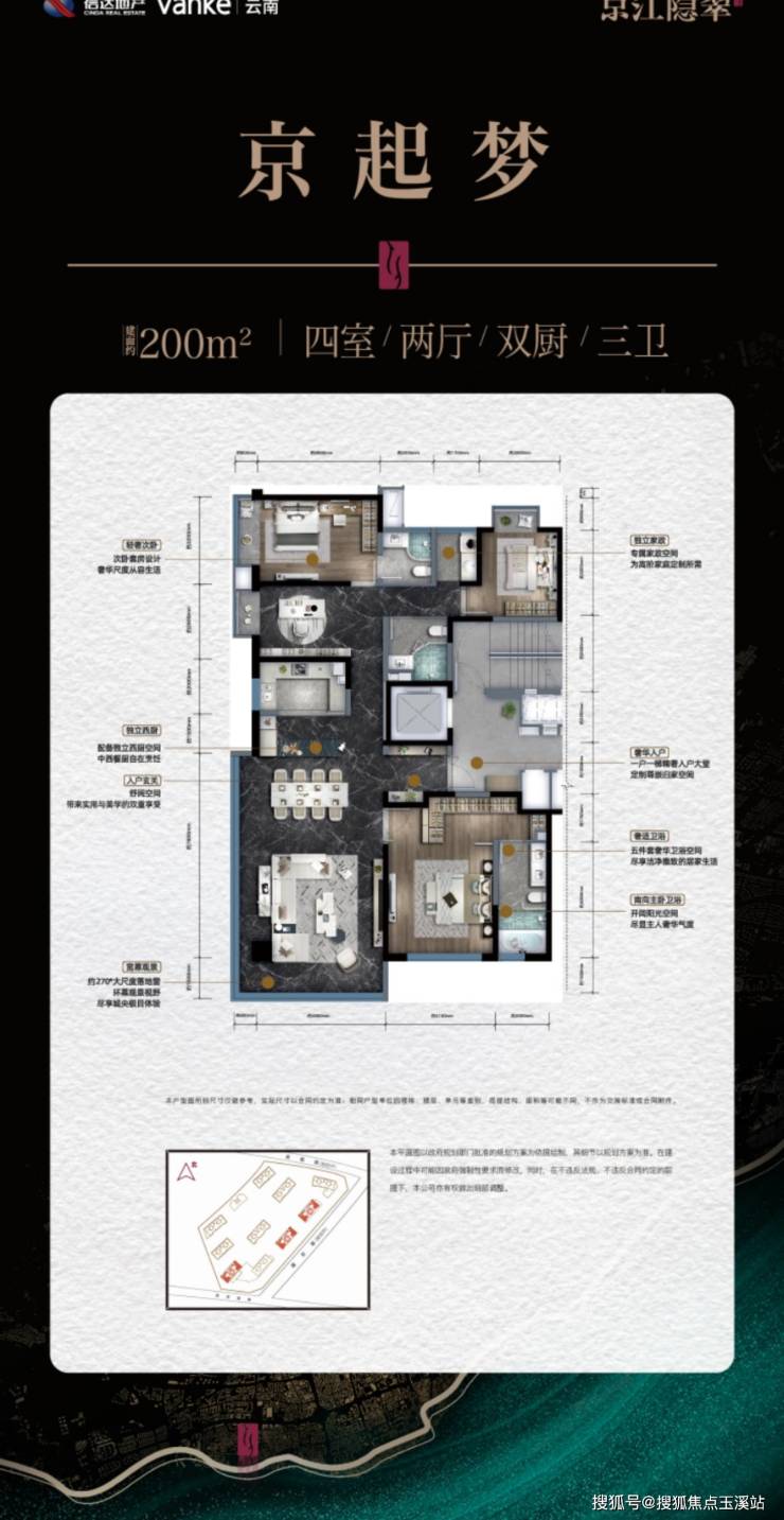 1. **空间革命**:1梯1户的私密性突破传统平层界限,158㎡起步的户型均配置双入户大堂与独立电梯厅。特别打造的200㎡「京起梦」户型,创新性采用LDK交互空间+中西双厨设计,南向主卧套房拥有7.2米面宽的临江视野,三卫配置满足多代同堂需求。