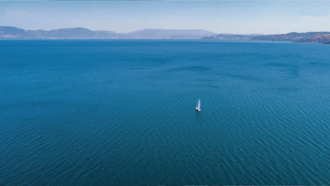 抚仙湖的夏天,亦有抚仙湖的蓝。抚仙湖水深邃的蓝与天空淡淡的蓝,与湖面上激烈航行的白色帆船,不突兀,反而自然。这蓝极为空旷,却又充盈饱满。