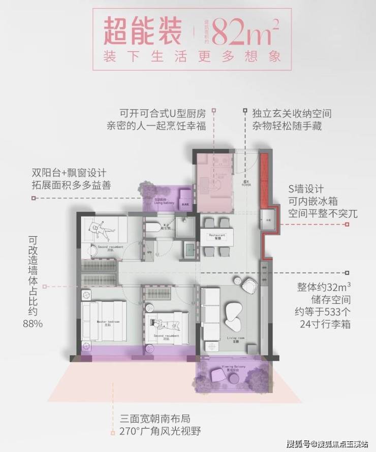 项目在得房率上实现行业突破,82-126㎡户型实得面积达78-127㎡,通过80%非承重墙设计赋予空间极致可变性。以126㎡户型为例,6.6米横厅配合30㎡赠送面积,可改造为4+2房;89㎡户型通过86%的可改造墙体,实现三居双卫的奢适配置;82㎡小户型则创新采用"四分离卫生间"和隐形收纳系统,创造出533个行李箱的储物空间。这种"生长型户型"理念,真正实现了"一套房,N种人生"的居住可能。