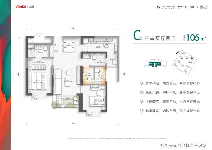 2 . 三面宽朝南,两卧室朝南,面宽资源最大,南向总面宽11.4m