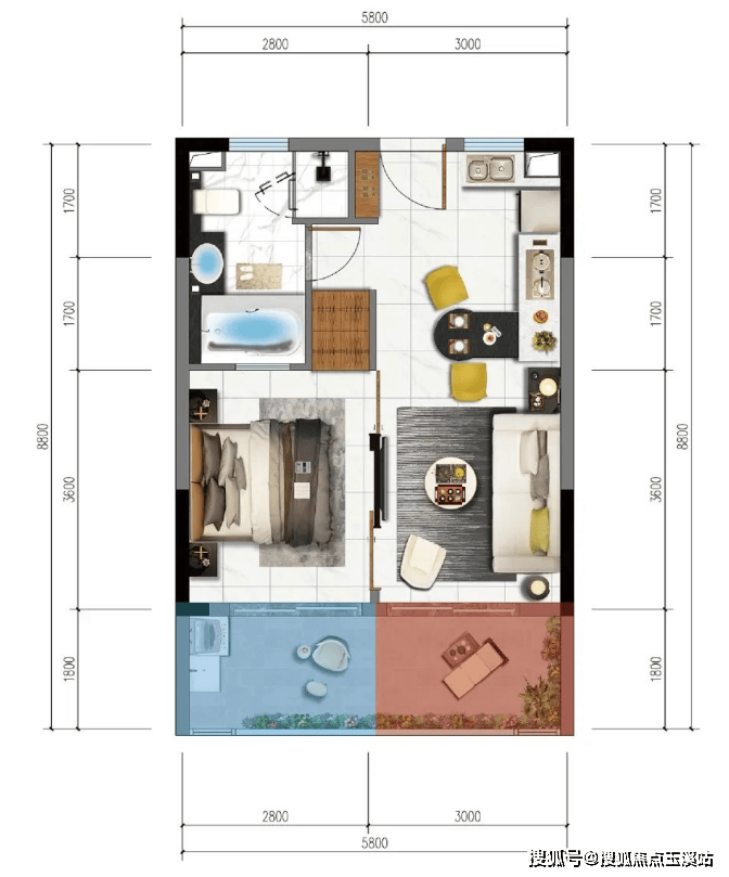 C户型 建筑面积56㎡ 扩展面积9㎡ 1室2厅1厨1卫1阳台