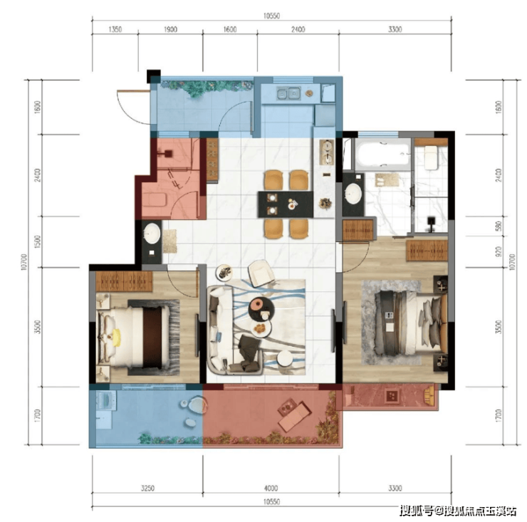 A户型 建筑面积90㎡ 扩展面积21㎡ 2室2厅1厨2卫1阳台