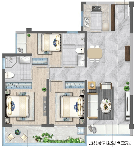 A1户型:建面约106㎡(三室两厅两卫)