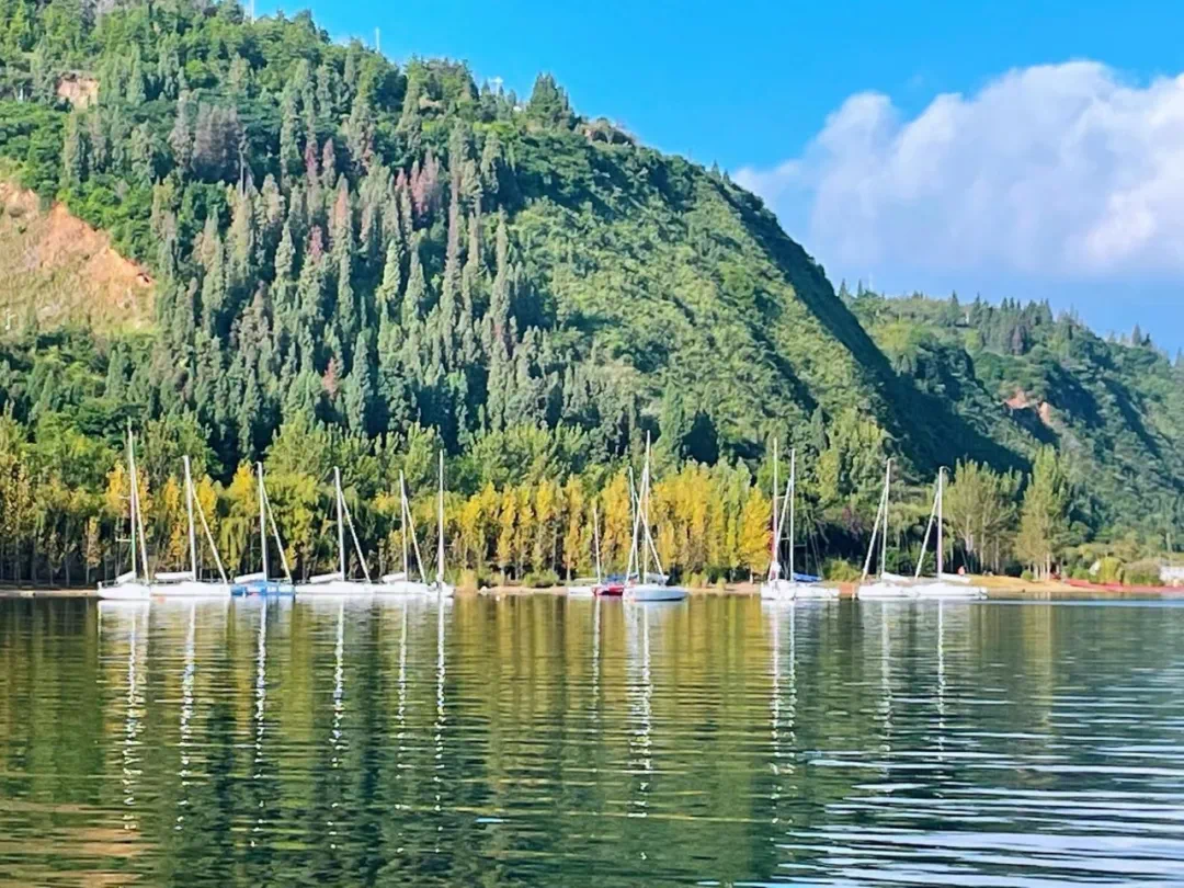 深秋的抚仙湖,澄江诗情画意聚集地。阳光明媚,空气清新,四面环山,绵延不绝。清澈湖面倒映着洁白的帆船,像一幅优美的油画。