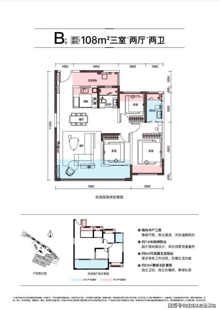 【B户型】三室两厅一厨两卫双阳台,建面约108㎡,实际使用面积约110㎡,实际得房率103%。