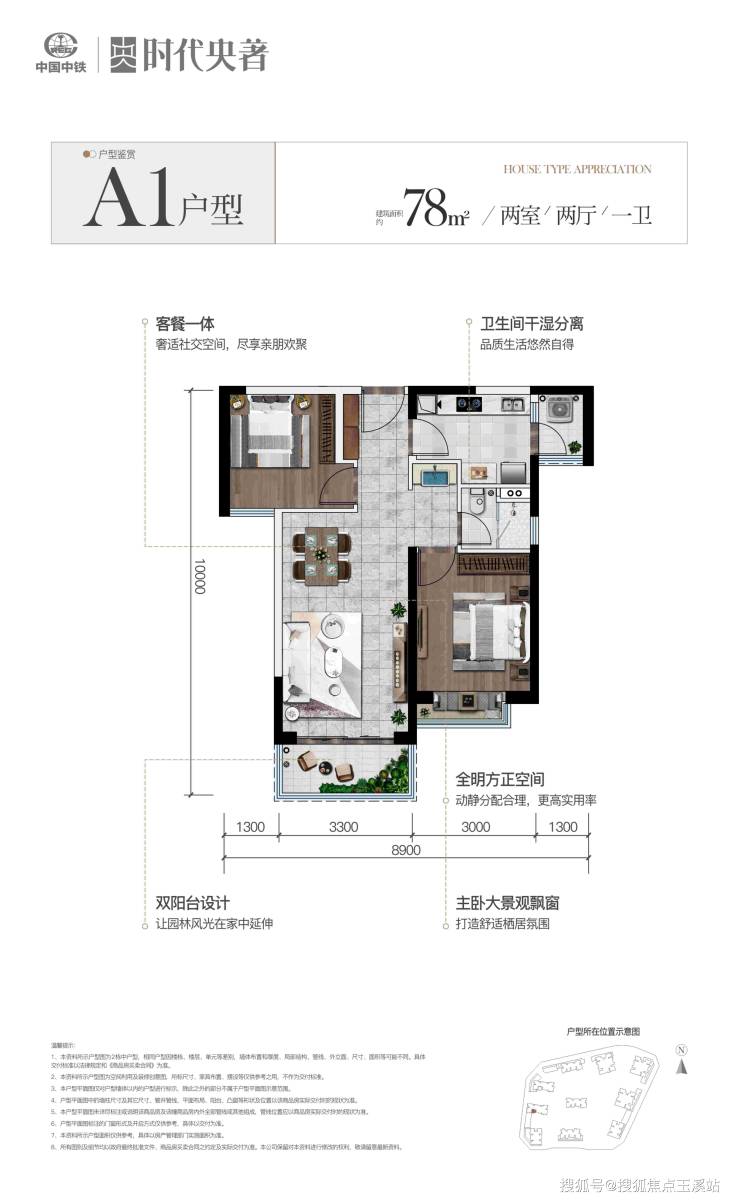 78㎡两房两厅一卫:采用3.6米客厅开间,U型厨房与双飘窗设计提升空间利用率