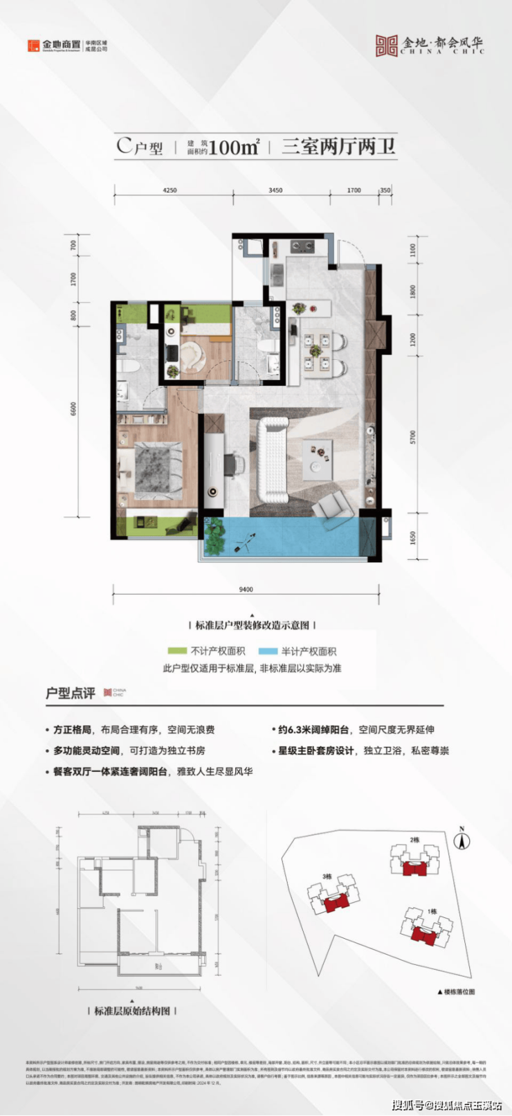 1、约100㎡三室两厅两卫,得房率约93.47%