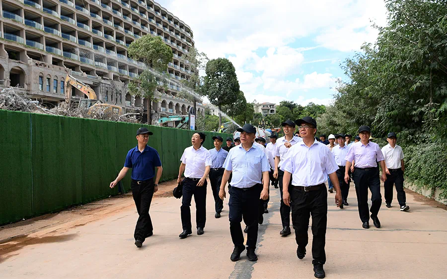 会前,现场观摩了九龙晟景项目3栋建筑拆除工作情况,了解推进做法。7月5日,九龙晟景项目3栋建筑开始拆除,标志着玉溪“三湖”沿岸违规违建整改工作全面启动。目前,拆除工作正有序推进。