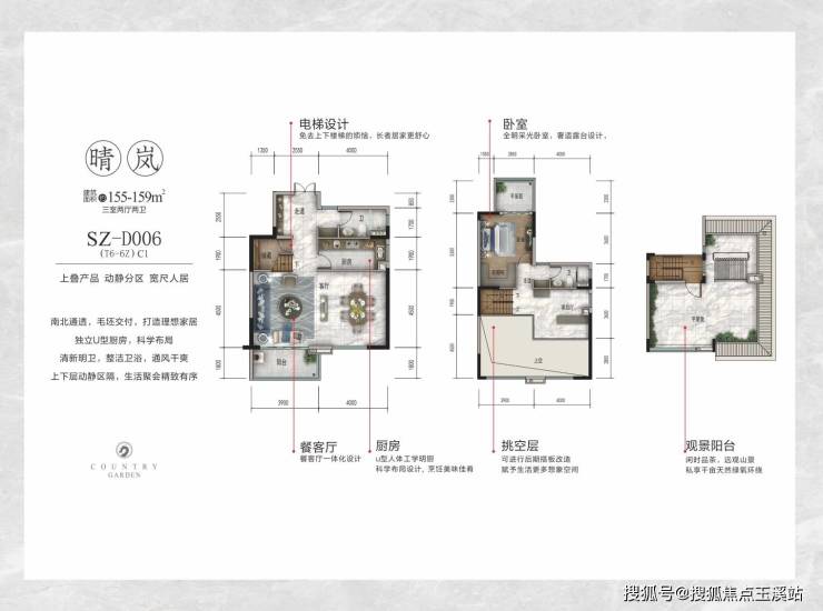 - **上叠产品**(155-159㎡)凭借45-60㎡屋顶花园与270㎡实得面积,成就观景视野最佳的250-280万级山景墅。