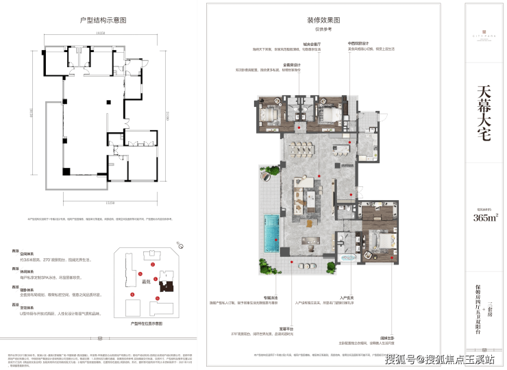 约3.6米层高,270度超大景观阳台,SPA泳池;中西式配套双厨房,120平奢阔客厅,尽显无界生活