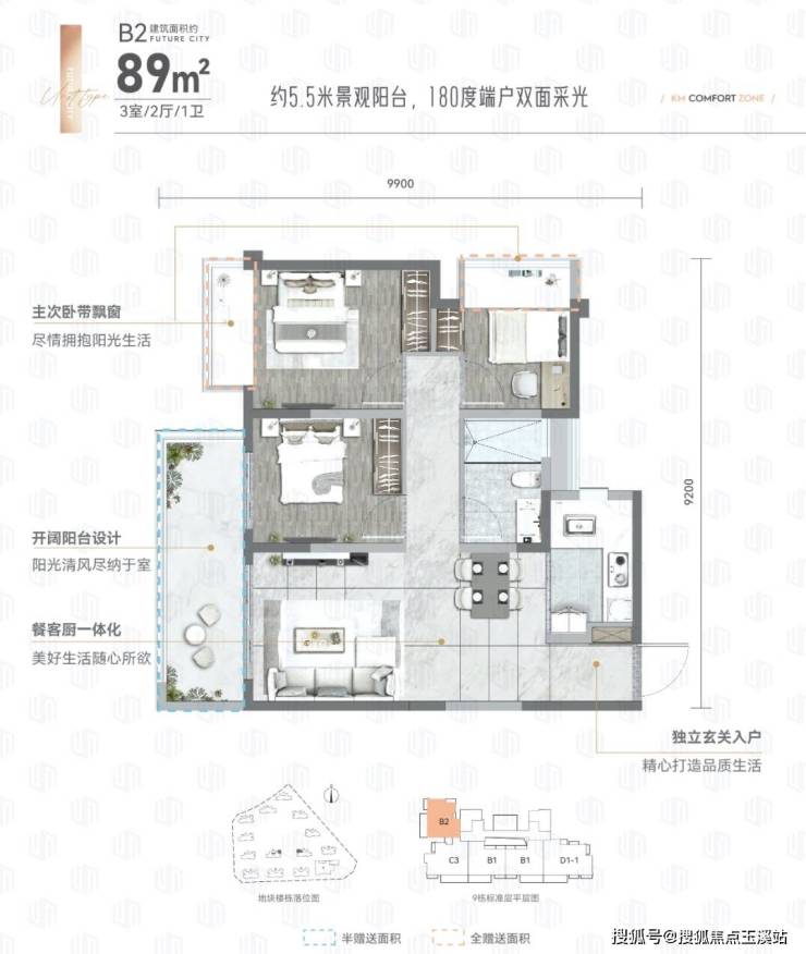89㎡ 3房2厅1卫 约5.5米景观阳台,180度端户双面采光