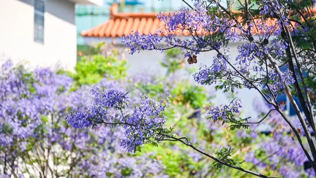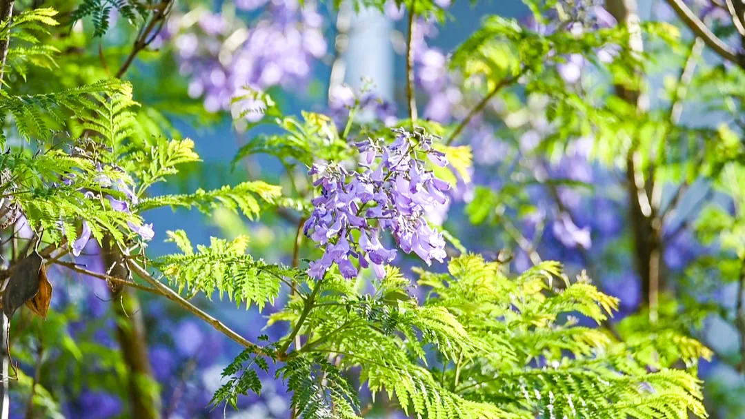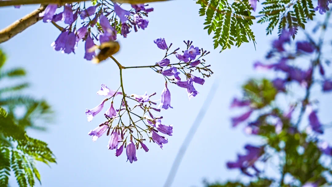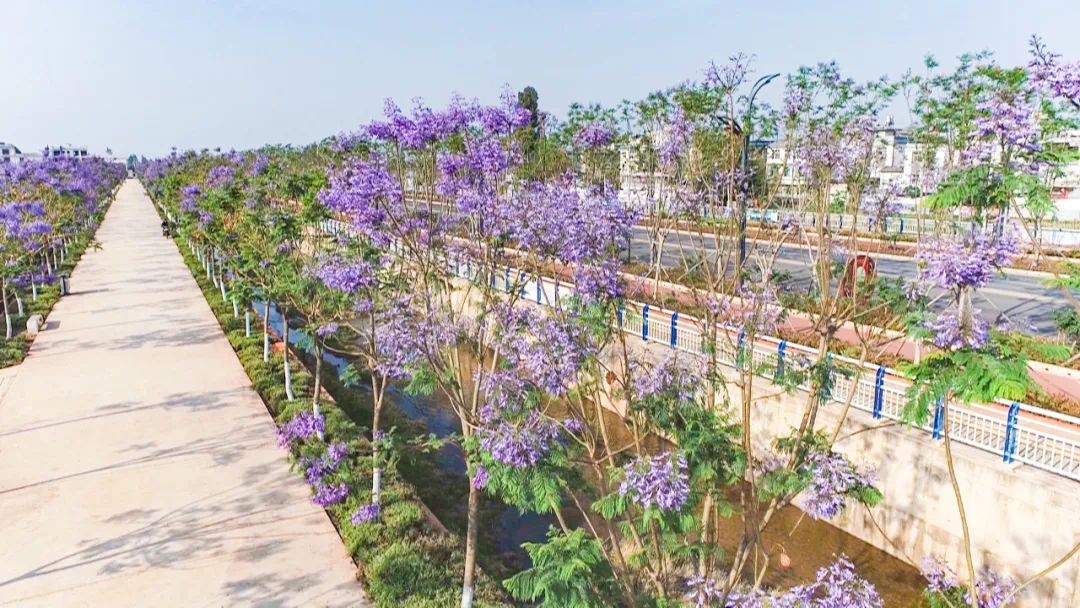 蓝花楹是观叶、观花树种,清雅的蓝紫色小花与遮荫的翠绿树叶相互衬托,因而经常被作为行道树栽植。在澄江市的各主次干道上,都能看到它的身影,澄江的蓝花楹一般在4~5月开始绽放,花期仅半个月。